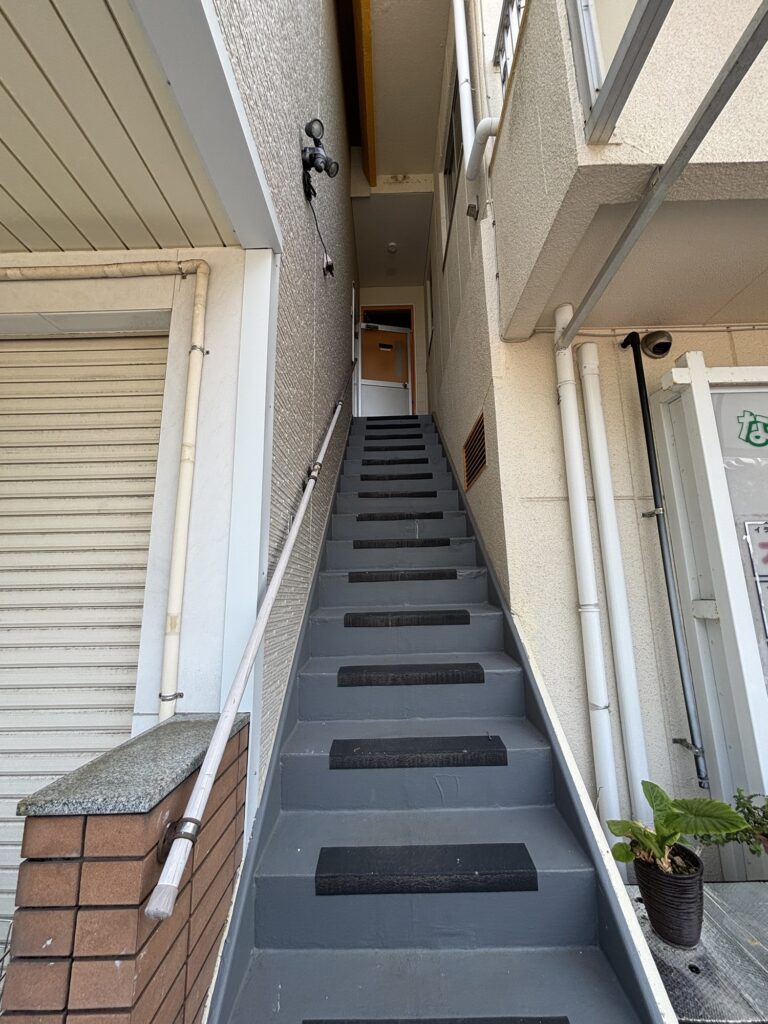正面向かって右手の階段をズンズン登って頂き、左手のドアをお開け下さい。