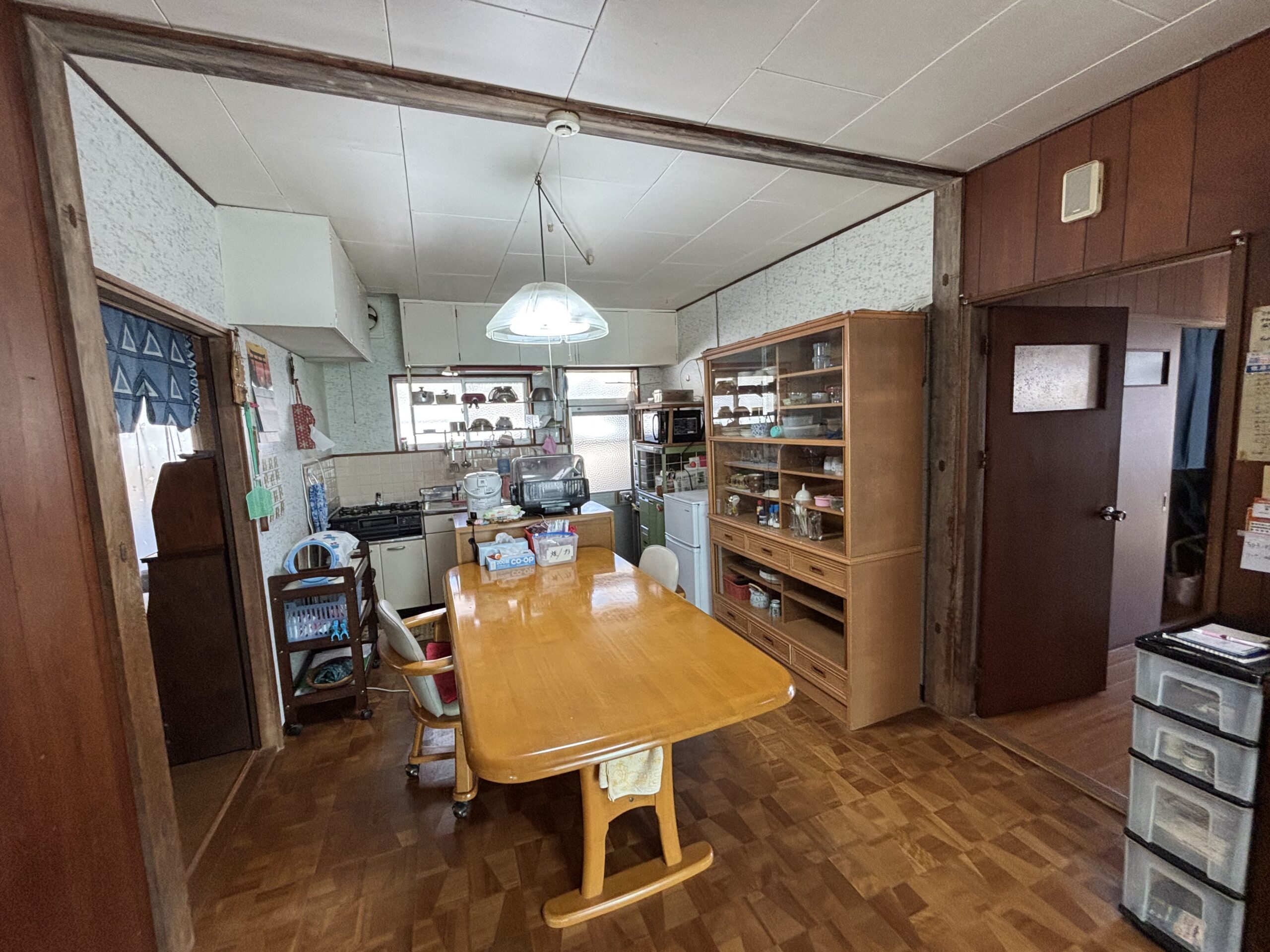 続いてダイニングキッチンですが、まだ残置物が残っているため生活感があふれ出しております。